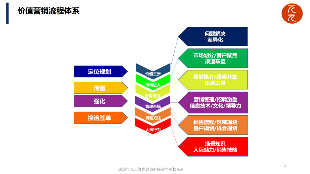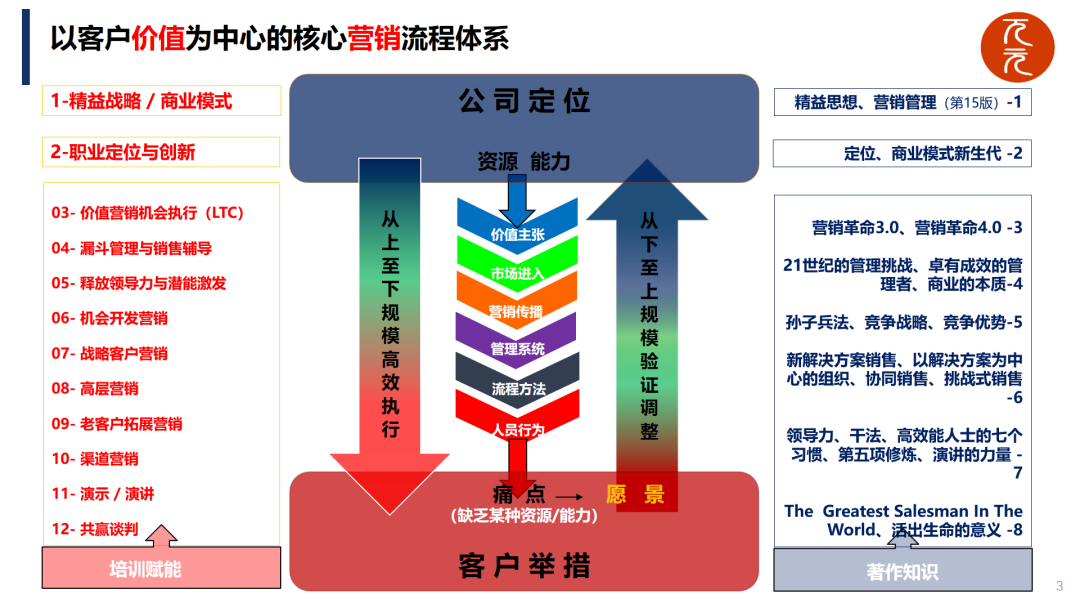 薄老师深入浅出地逐个讲解了价值营销流程体系的六个重要环节:价值主张、市场进入、营销传播、管理系统、流程方法和人员行为。这些环节相互关联,形成了一个自动化闭环流程。通过高质量高效率的规模化营销执行,企业可以不断优化自身定位和价值主张,适应市场变化,持续进步并追求卓越。