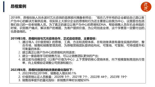 随后,薄鑫老师生动地分享了四个成功案例。这些案例表明,通过实施价值营销策略,企业能够实现从以产品和自我为中心转型到以解决客户问题为中心,并建立比产品差异化更重要的营销方式差异化。这些企业步入高绩效营销的发展轨道,收入业绩不断持续提升。