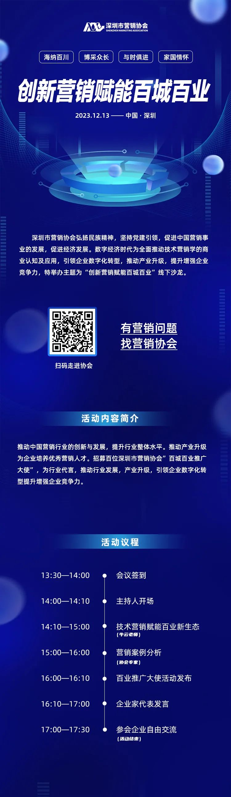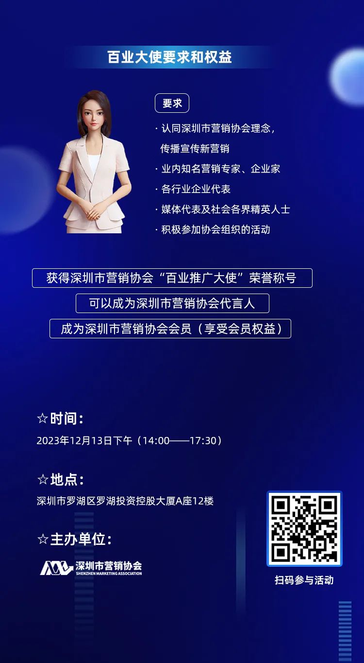 此外,为推动产业升级,为企业培养优秀营销人才。特招募百位深圳市营销协会"百城百业推广大使”,为行业代言。未来,这些推广大使将致力于为行业发展、产业升级以及企业数字化转型提供强大的支持,并帮助企业实现数字化转型,从而提升竞争力和市场影响力。
