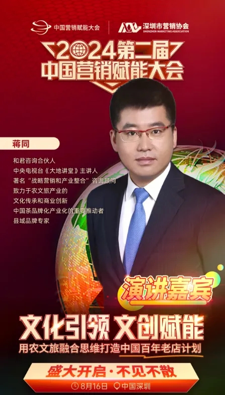 和君咨询合伙人、著名“战略营销和产业整合”专家蒋同,是战略营销和产业整合专家,中国茶品牌化、产业化的重要推动者, CCTV嘉宾顾问,北京大学、清华大学、新疆财经大学总裁班客座。积极实践“品牌壮大+产业繁荣+农民幸福”,曾实地考察中国两千余县,长期担任企业和地方政府的智囊,著有《中国茶事:中国茶业复兴实践案例》、《“一县一业”这样干》。
