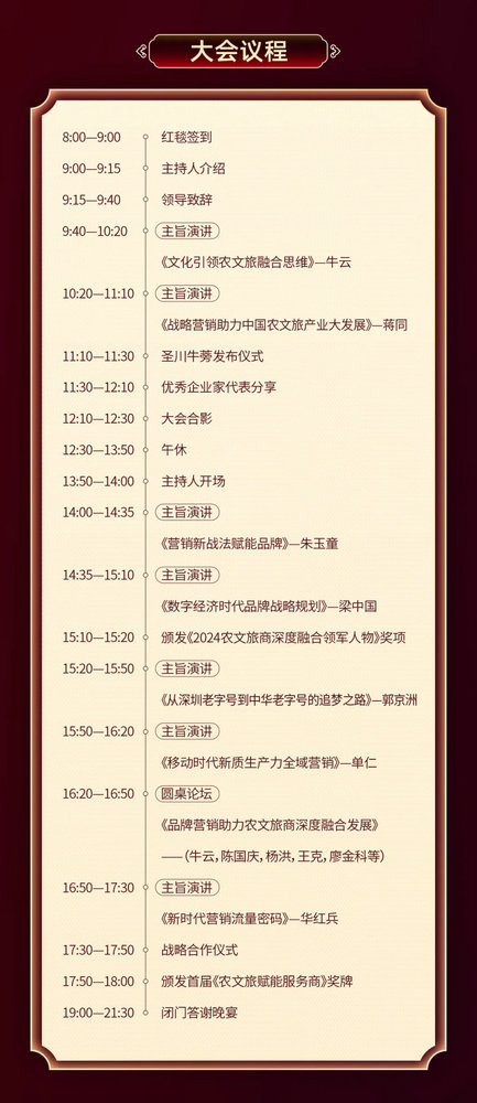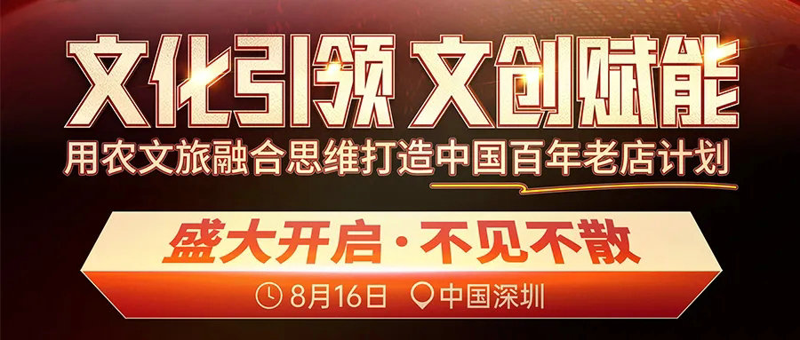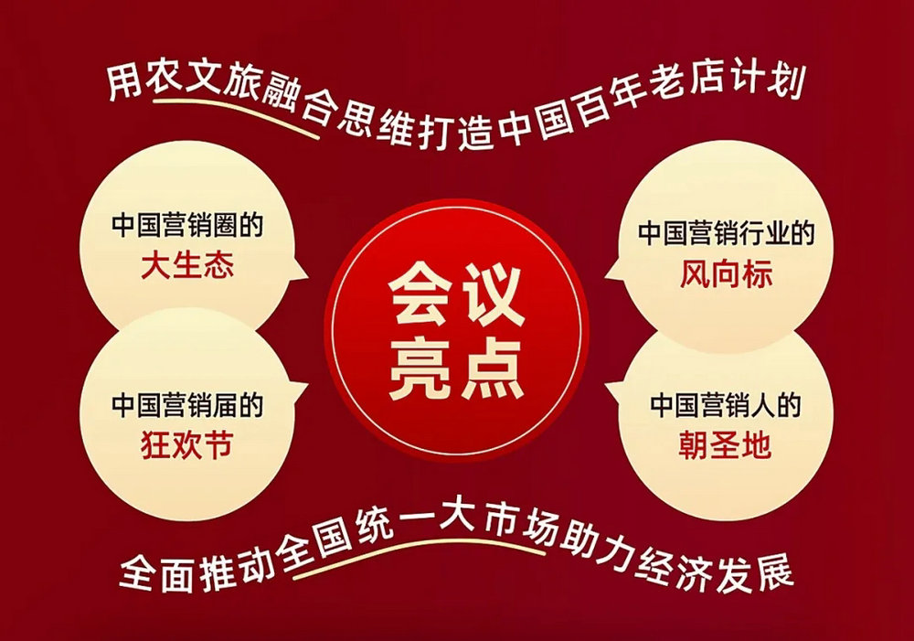 本届大会以“文化引领,文创赋能,用农文旅融合思维打造中国百年老店计划”为主题,旨在将中国传统优秀文化转化为文创赋能,用文创思维助力农特产品的品牌升级和营销赋能,把旅游景点构建为农产品出村进城的渠道,加速实现农文旅商深度融合,为打造“中国百年老店计划”赋能护航。届时,来自各行业企业家、各商协会、品牌连锁、媒体等代表,品牌营销专家、文化领域中百业融合创新专家、旅游领域专家等1000余人将齐聚一堂,共话数字时代新机遇与新趋势,共探中国传统文化如何引领世界文化潮流,共建品牌营销新未来!