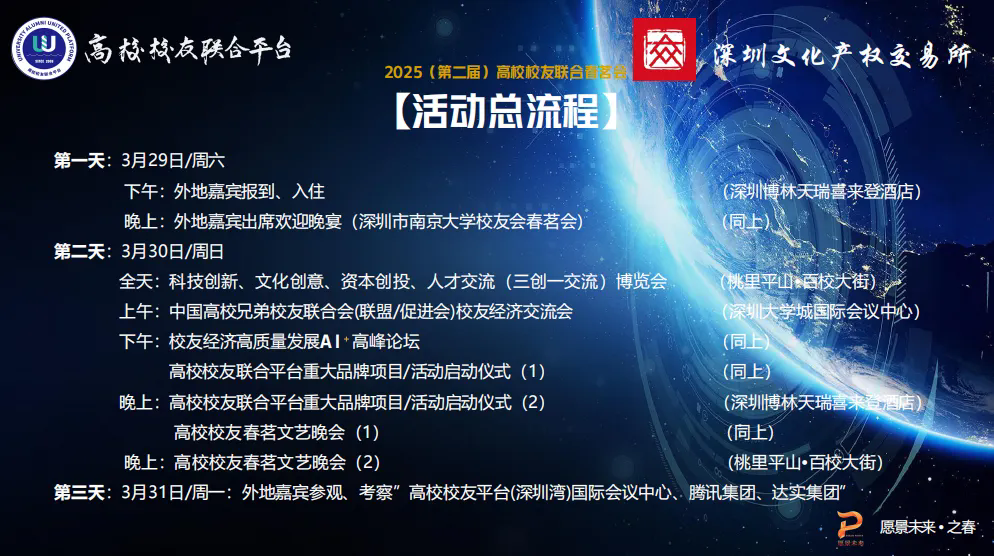 活动内容精彩纷呈,包含国内高校校友联合会与校友经济促进会经验交流会、科技创新与文化创意展示、资本创投项目对接、高质量发展高峰论坛、授牌与签约仪式以及文艺晚会等,旨在促进高校校友交流合作,推动校友经济高质量发展,为粤港澳大湾区建设注入新动力。