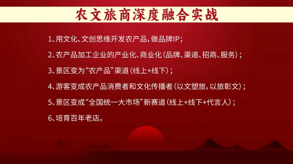 农文旅融合,是用文化思维和文创思维为农产品赋能,赋能指的是创意设计,把旅游景点作为渠道,农产品以文化产品和文创产品的形式进驻旅游景点,进驻的形式是虚实结合,可以是实物,也可以是码。通过实物或码把游客变成消费者和渠道,为农产品代言以及传播当地文化。这种创新的模式不仅丰富了旅游景点的文化内涵,也为农产品开拓了更广阔的市场。