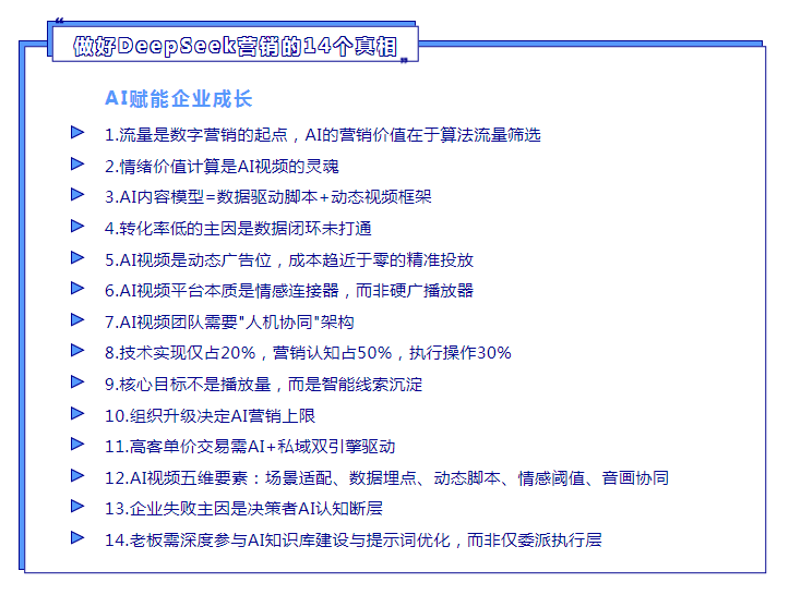 张斌老师为大家分享了AI营销的14个真相,包括:流量筛选、情绪价值计算、数据驱动脚本、人机协同等方面,为企业提供了AI营销的实战指南。这些真相揭示了AI营销的本质和关键点,为企业在AI时代进行有效营销提供了指导。