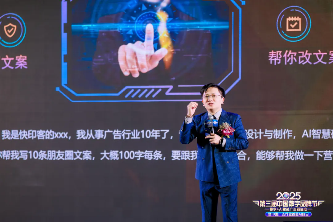 2025年3月18日,由深圳市营销协会、快印客大生态系统联合主办的智链苍穹 广告觉醒——2025第三届中国数字品牌节数字+AI赋能广告新生态暨中国广告行业首届AI峰会在深圳隆重召开。本次峰会聚焦AI技术对广告行业的重塑与变革,以文创赋能思维讲好中国故事,以AI技术与数字品牌共享为新时代全面赋能,推动农文旅商深度融合,助力加快“全国统一大市场”建设实现新突破,开启智能广告的新纪元。